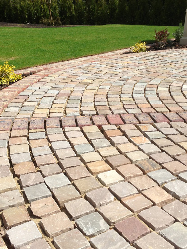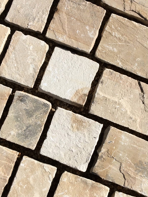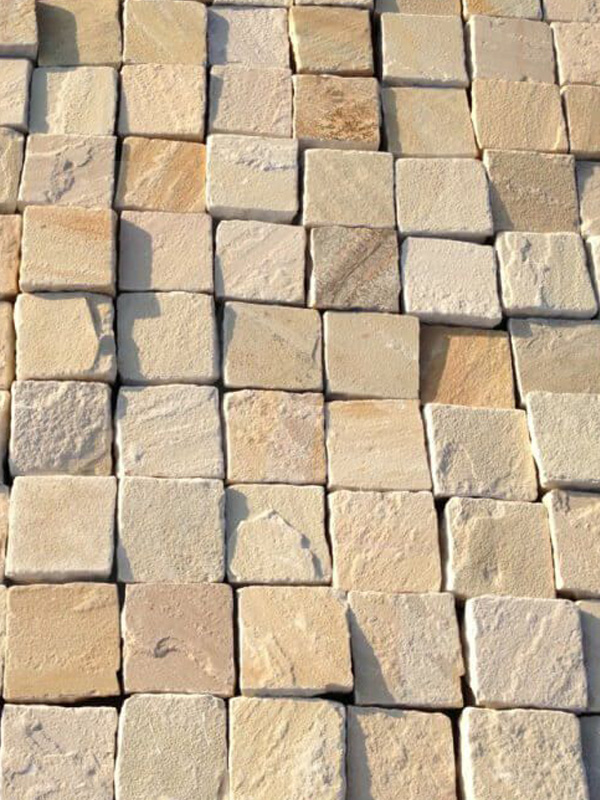 Fossil Mint Sandstone cobbles is a hand chiseled block paving’s that tapers from top towards bottom surface which provides perfect setting. Available in wide range of size and thickness, they can b…